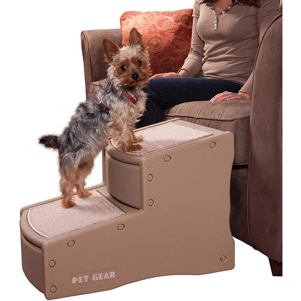 Pet Gear, Inc. Easy Step II Pet Stair has wide, deep steps to give smaller dogs the ability to get their entire body on each platform and large dogs the ability to comfortably climb the stairs. The innovative incline of each step reduces the amount of stairs needed to climb eliminating stress on your pet. The carpet tread removes easily and is machine washable. The stair easily snaps together (no tools required). Capacity 150 lbs22"L x16"W x16"H
