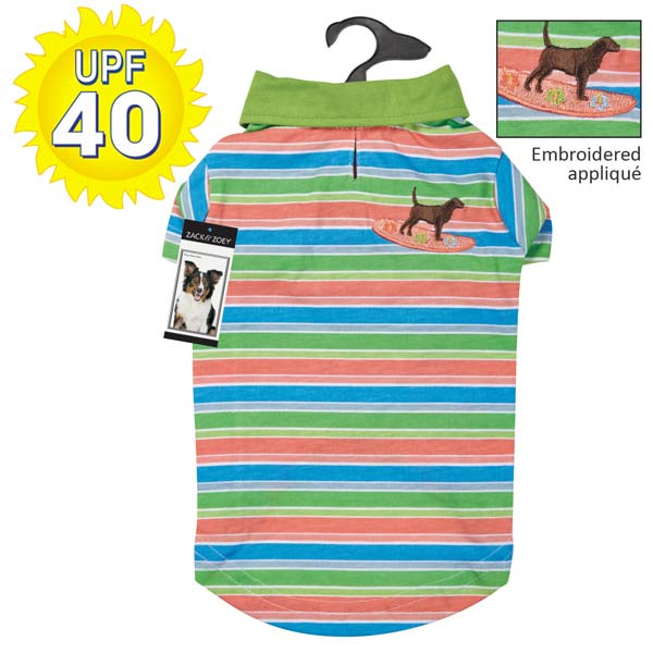 This striped Casual Canine Hawaiian Breeze UPF 40 Polo Shirt with contrast trim sports an embroidered dog on a surfboard, as a playful detail.