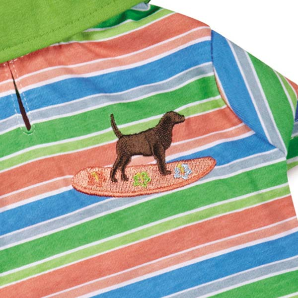 This striped Casual Canine Hawaiian Breeze UPF 40 Polo Shirt with contrast trim sports an embroidered dog on a surfboard, as a playful detail.