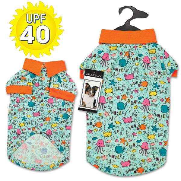 El estilo clásico de la popular camiseta de polo Zack & Zoey Sun and Sea UPF 40 recibe una actualización de moda con este estampado divertido y colorido.