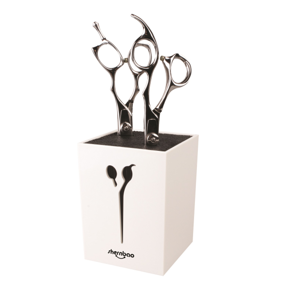 Aparato para sostener una o varias tijeras de forma vertical para evitar golpes o caidas, se encuentran disponibles en color blanco,negro y verde.