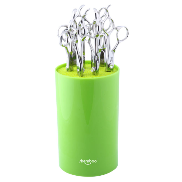 Aparato para sostener una o varias tijeras de forma vertical para evitar golpes o caidas, se encuentran disponibles en color azul, verde, naranja y púrpura.