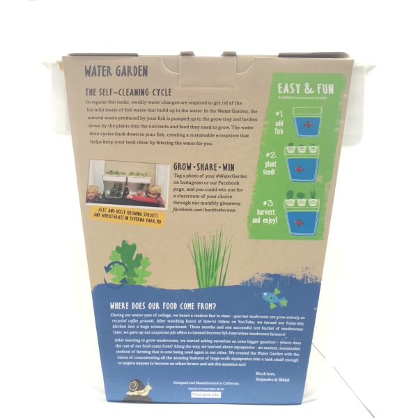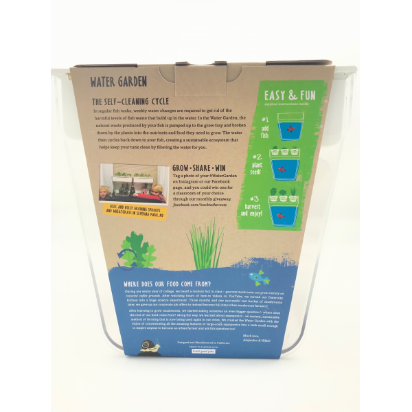 After learning to grow mushrooms, we started asking ourselves an even bigger question - where does the rest of our food come from? Along the way, we learned about aquaponics-an ancient, sustainable method of farming that is now being used again in our cities. We created the Water Garden with the vision of concentrating all the amazing features of large-scale aquaponics into a tank small enough to inspire anyone to become an urban farmer and ask this question too!