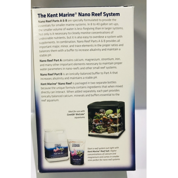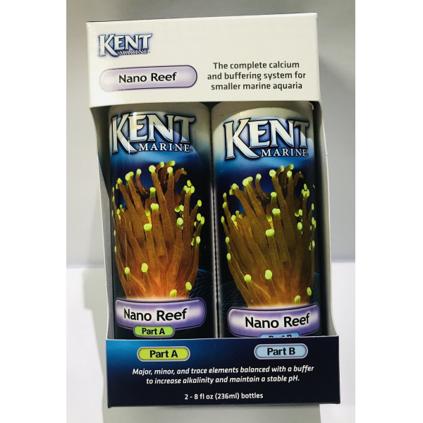 Kent Marine Nano Reef is packaged in two separate bottles directly can interact. When added separately, each part provides ionically balanced calcium, minerals and buffers essential to the reef aquarium.