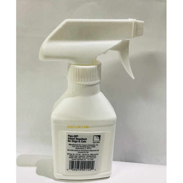 FLYS OFF. Insect Repellent for Dogs and Cats. Kill fleas, lice, ticks. Temporally Repels Gnats, Files, Mosquitoes. Pump-spray bottle Use Restrictions: Use only on dogs and non-food/non-feed surfaces to repel flies, gnats and mosquitoes. DO NOT USE ON PUPPIES LESS THAN 12 WEEKS OLD OR ON CATS. Consult a veterinarian before using this product on debilitated, aged, pregnant, nursing, or medicated animals. Sensitivities may occur after using ANY pesticide product for pets. Net Contents: 6 oz (177 ml)