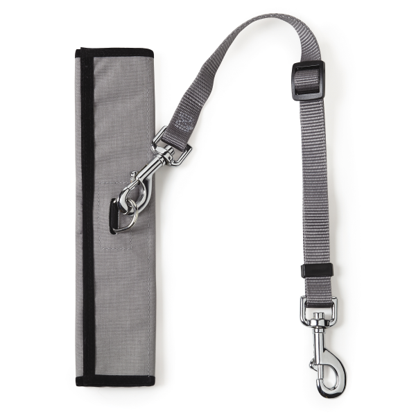 Using the nickel-plated swivel clip, attach your dogs harness to the nickel-plated ring on the seat belt connector.