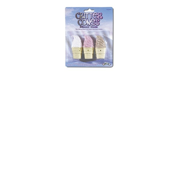 ENGLISH:Critter Cones Mineral Treats, 3 Pack.Critter Cones are the nutritious mineral treats that looks and smells like real ice cream. Each cone is the perfect combination of a tasty treat and nutritious supplement. These all natural mineral treats include calcium for strong bones and proper muscle function plus sulfur to maintain healthy fur. Promotes good health plus clean teeth for you furry friend. 3 Pack of cones makes a colorful assortment of healthy treats. Each cone is 3" long.