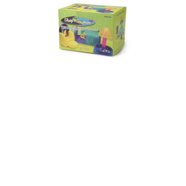 Exciting bedroom ensemble for your pet hamsters, gerbils or mice. Decorate your pets habitat with this stylish bedroom furniture. Set includes a Sleep-N-Slumber Bed, Peek-N- See Vanity, and a Sip-N-Snack Lamp. All components are made of safe, durable, translucent plastic and comes in a variety of cool colors.