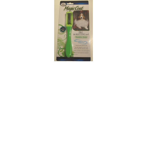ENGLISH: Four Paws. Magic Coat. Sensitive areas. Prevents mats before they occur. For fine to medium to coarse texture hair. Designed for full body grooming. Removes loose and dead mat-causing hair. Gently and easily detangles matted hair. Stainless steel blades comb easily through fur. A once a week comb through with tha Magic Coat de-Matting tool for Total Body will keep your pet´s coat tangle free, mat free and beautifully groomed. The stainless steel blades comb through pet fur, removing loose and dead mat-causing hair, hile gently and easily detangling matted hair. The Pro de-Matting tool´s contour shape and rubberized handle provide a firm comfortable gripDirections:
