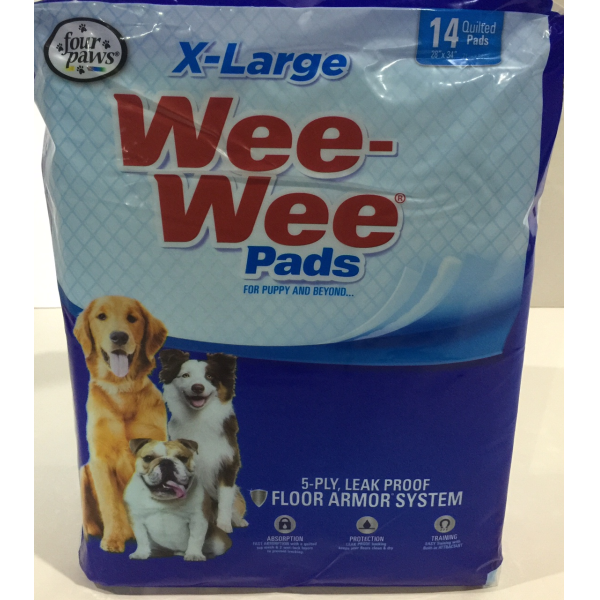 ESPAÑOL Four Paws. Wee-Wee Almohadillas Extra Grandes son 80 % mas grandes y son mas absorbentes que el avarage, vienen en paquetes de 14 unidades con las siguientes dimensiones 28 pulgadas de largo (71.08cm) x 34 pulgadas de ancho (86.36cm). Almohadillas para enseñar a los cachorros. Ideal para usar en jaulas de perros. El forro de plástico ayuda a prevenir daños a los suelos y alfombras. Utilizado y recomendado por veterinarios. Instrucciones: Simplemente coloque las almohadillas Wee-Wee Pads (con el recubrimiento de plástico hacia abajo) en el suelo, cerca del lugar donde se mantiene el cachorro. En pocos días el cachorro habrá aprendido los hábitos correctos con entrenamiento y ya no necesitara utilizar la almohadilla. Después de usadas las almohadillas pueden desecharse en la basura.