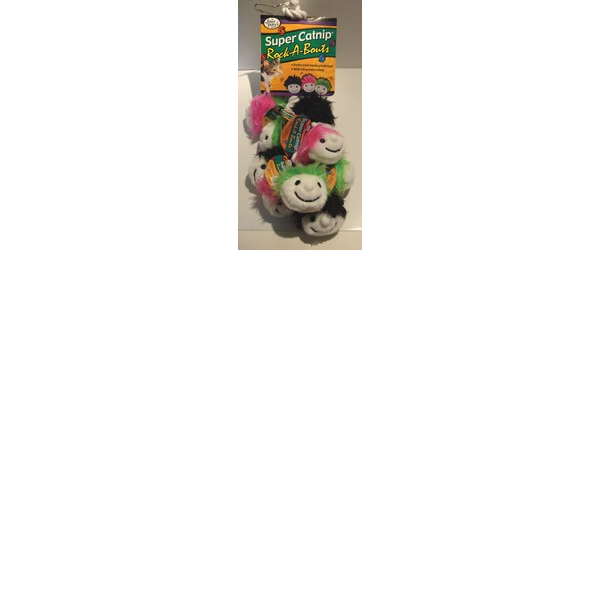 ENGLISH: Four Paws. Super Catnip Rock-a-bouts. Loaded with USA harvested catnip, a tantalizing rattling ball inside, and made of furry, soft, colored cotton guarantees cats’ playtime fun!