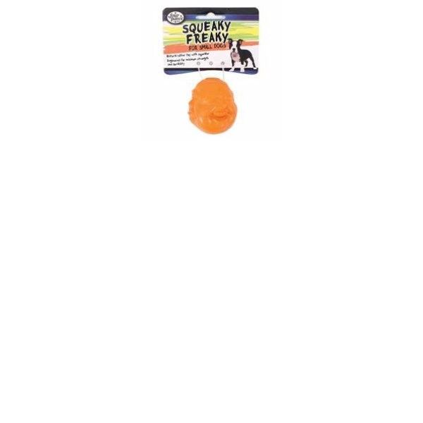 ENGLISH: Squeaky Freaky for Small dogs. Natural rubber toy with sqeoker. Engineered for maximum strength and durability. Rubber toys are excellent for cleaning and massaging your dogs gums. Rubber toys are a great interactive toy for your dog to enjoy. Caution: Always supervise your dig when playing with all toys. Remove the toy from pet immediately if any part become loose or detached.