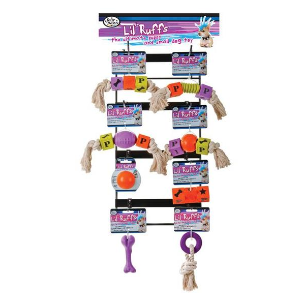 ENGLISH: Four Paws. Lil´Ruffs rubber toys. The Lil´Ruffs assortment includes eight different SKUs. Each Lil´Ruffs SKU has increased tensile strength to withstand a puppy´s innate desire to chew and for the inherently plaful nature of most small dog breeds. Assorted colors are purple, orange and lime.