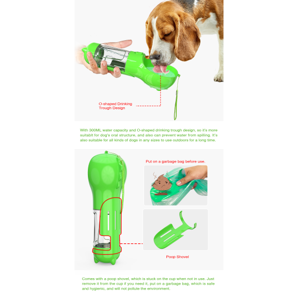 Size: 98*98*386mm Contenedor para agua, bolsa para desechos, contenedor para comida, pala para recoger desechos, contenedor para beber agua. Material: Thermoplastico.