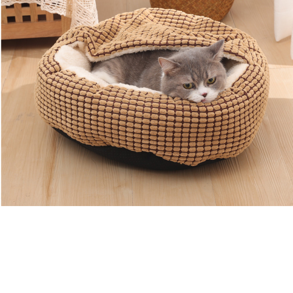 Cama redonda con cobija. Materiales: Terciopelo de maíz, propileno y algodon. Medidas: Small: 40 cm diámetro. Medium: 50 cm diámetro. Large: 60 cm diámetro. Xlarge: 70 cm diámetro.