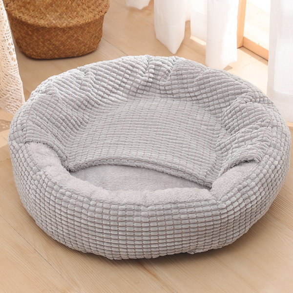 Cama redonda con cobija. Materiales: Terciopelo de maíz, propileno y algodon. Medidas: Small: 40 cm diámetro. Medium: 50 cm diámetro. Large: 60 cm diámetro. Xlarge: 70 cm diámetro.
