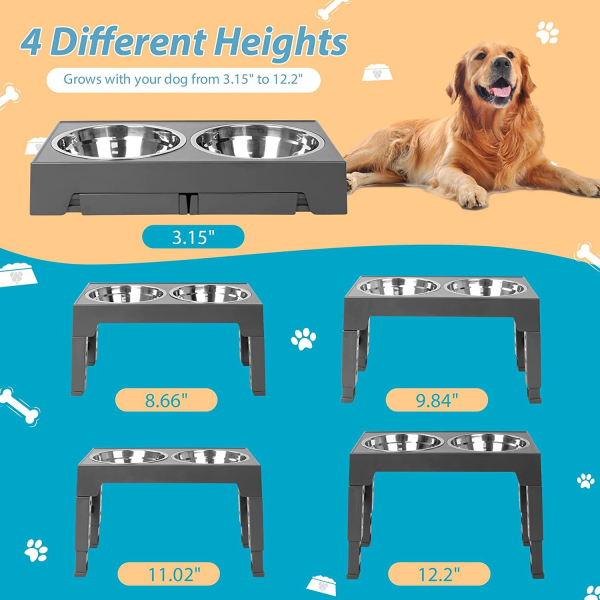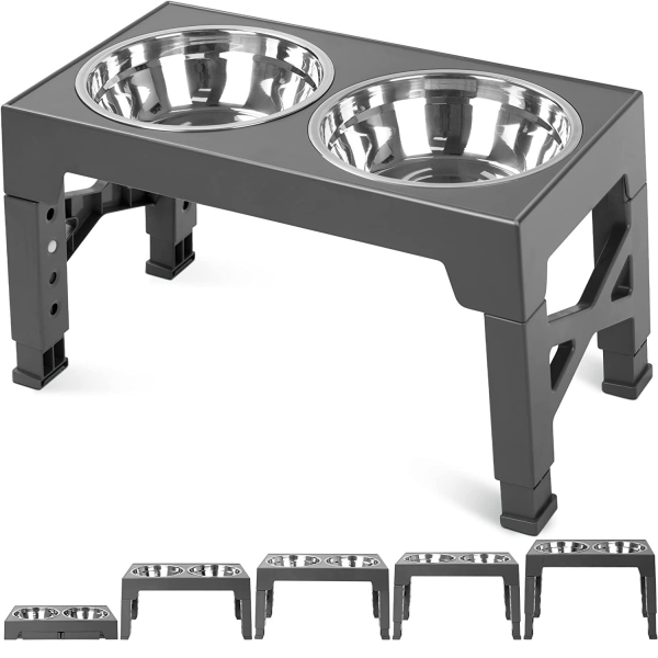 Comedero doble elevado, 5 alturas, color gris con dos platos de acero inoxidable. Medidas: 41 cm x 23 cm x 30 cm Alturas: 8 cm, 22 cm, 25 cm, 28 cm, 30 cm.