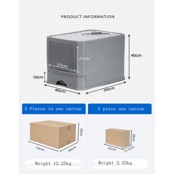 Litera cerrada con bandeja y pala. Material: plastico pp. Medidas: 50 cm x 40 cm x 40 cm.