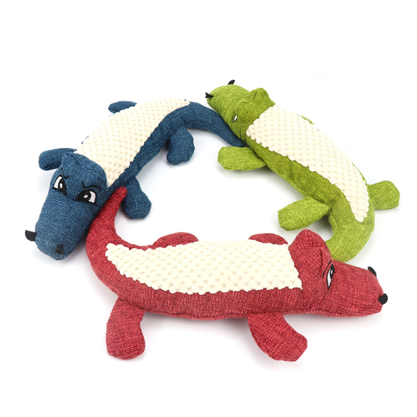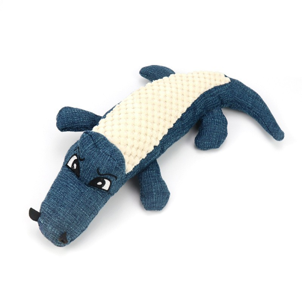 Juguete de cocodrilo para mascotas. Material: Algodon, platico, lino y contiene una chirriador. Medias: 29 cm x 15 cm x 6 cm.