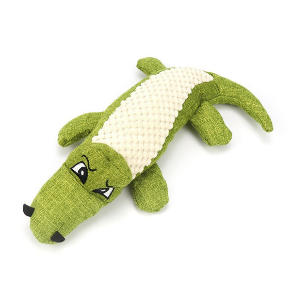 Juguete de cocodrilo para mascotas. Material: Algodon, platico, lino y contiene una chirriador. Medias: 29 cm x 15 cm x 6 cm.
