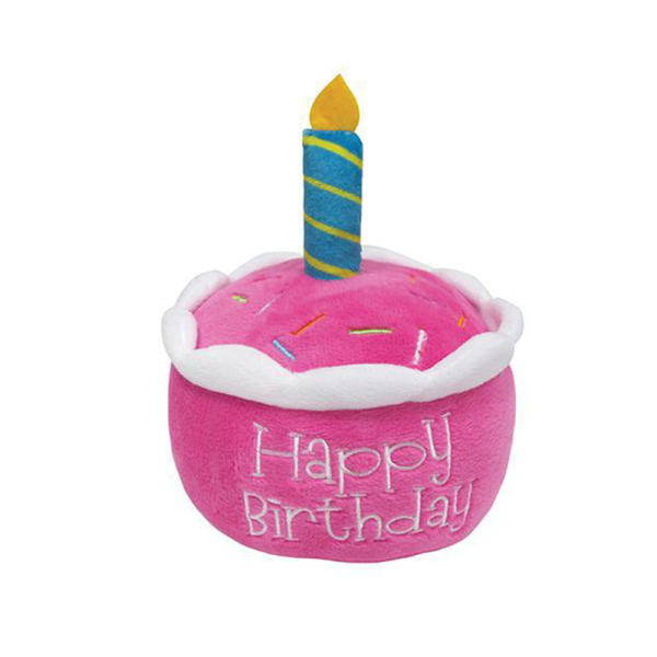 Juguete de queque de cumpleaños rosado. Material: felpa, contiene chirriador. Medidas: 11.5 cm x 12.5 cm.