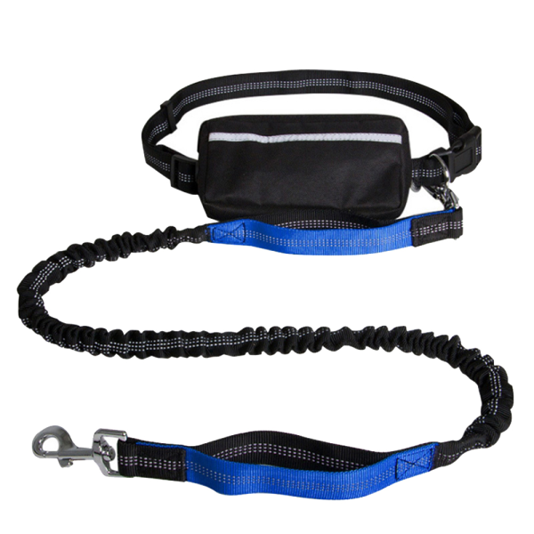 Correa elástica y cinturon manos libres. Material: nylon, reflectivo con cierre de acero. Medidas: Cinturon ajustable 85 cm a 130 cm. Correa 130-150 cm