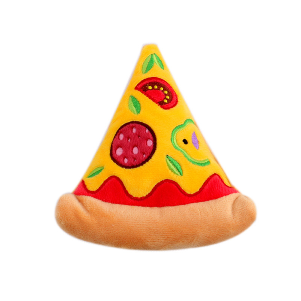 Juguete de pizza para mascota. Material: algodón polipropileno, papel crujiente, y con chirriador adentro. Medidas: Largo 16 cm x Ancho 14 cm x Alto 4 cm.