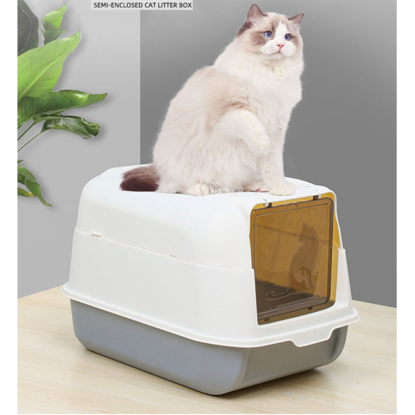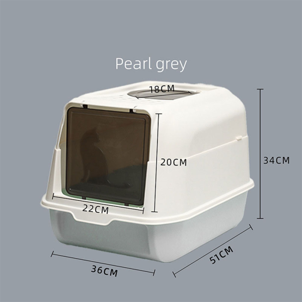 Litera para gato cerrada con puerta blanca con gris. Material: Plastico pp. Medidas: 51 cm x 36 cm x 24 cm.