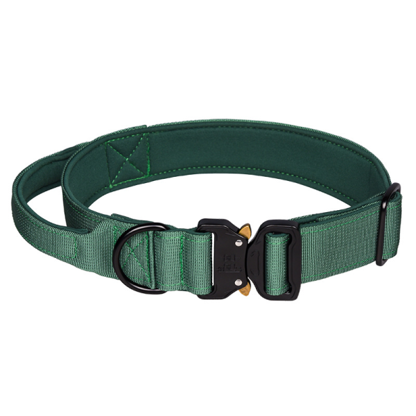 Collar con agarradera. Material: nylon y hebilla de zinc Medidas: Medium: ancho 3.8 cm, ajustable 37-45 cm Large: ancho 3.8 cm, ajustable 43-55 cm Xlarge: ancho 3.8 cm, ajustable 49-65 cm