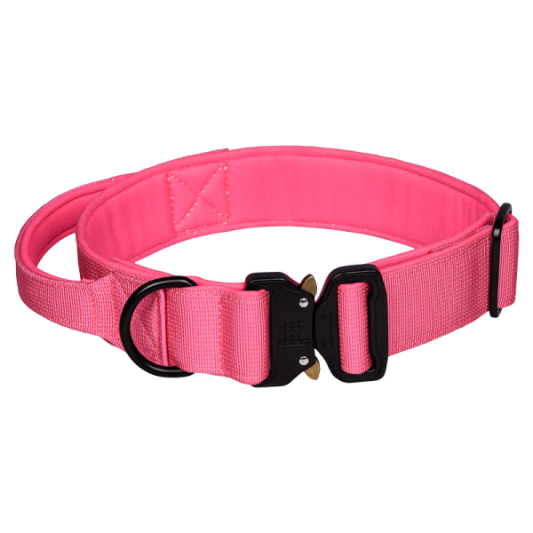 Collar con agarradera. Material: nylon y hebilla de zinc Medidas: Medium: ancho 3.8 cm, ajustable 37-45 cm Large: ancho 3.8 cm, ajustable 43-55 cm Xlarge: ancho 3.8 cm, ajustable 49-65 cm