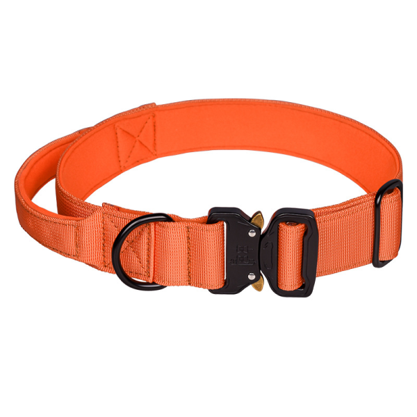 Collar con agarradera. Material: nylon y hebilla de zinc Medidas: Medium: ancho 3.8 cm, ajustable 37-45 cm Large: ancho 3.8 cm, ajustable 43-55 cm Xlarge: ancho 3.8 cm, ajustable 49-65 cm