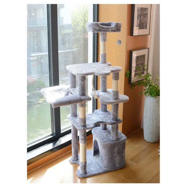 Poste rascador gris. Material: sisal, lana y tablero aglomerado. Medidas: 145 cm altura, 52 cm de largo y 48 cm de ancho.