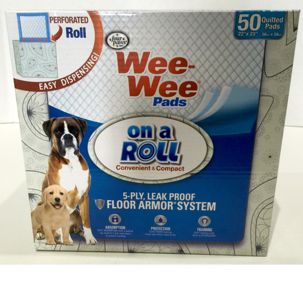 Wee wee pads on a roll convenient and compact, 50 quilted pads 22 in x 23 in, 56 cm x 58 cm.