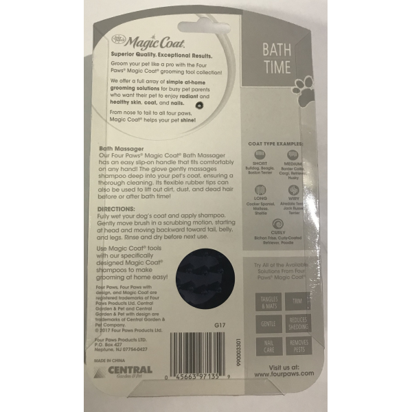 OUR FOUR PAWS MAGIC COAT BATH MASSAGER HAS AN EASY SLIP-ON HANDLE THAT FITS COMFORTABLY ON ANY HAND! THE GLOVE GENTLY MASSAGES SHAMPOO DEEP INTO YOUR PETS COAT, ENSURING A THOROUGH CKEANING. ITS FLEXIBLE RUBBER TIPS CAN ALSO BE USED TO LIFT OUT DIRT, DUST, AND DEAD HAIR BEFORE OR AFTER BATH TIME!