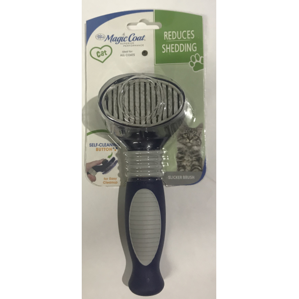 Self-cleaning slicker brush is specifically designed with a smaller head for cats, allowing for gentler detangling in hard-to-reach areas. the brush is designed to easily remove mats and dead hair while stimulating the skin increasing coat shine. The easy-to-clean brush features a push button for quick removal of hair from the tool.