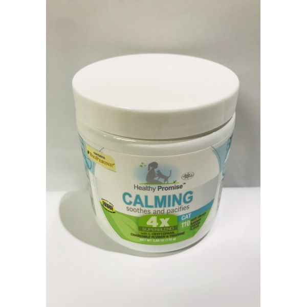 FOUR PAWS. Healthy Promise. Calming, soothes and pacifies. For cat, 110 soft chews savory chicken flavor, 4x superblend with L-Truptophan Chamomile Flower & Thiamine. NET WT 3.38 OZ (110 g)