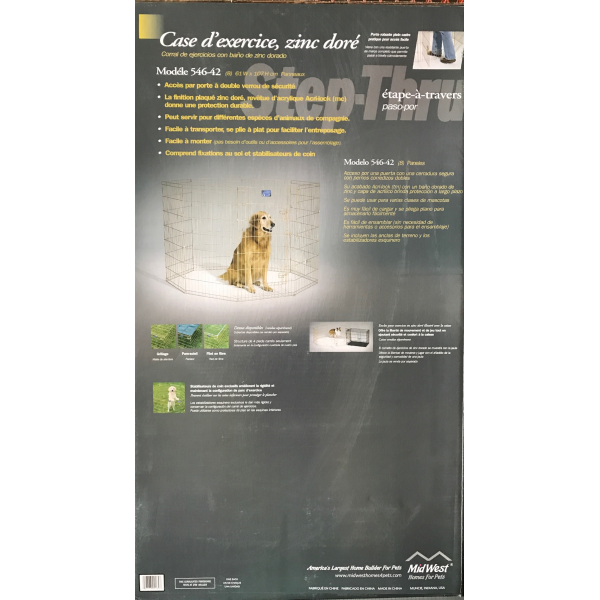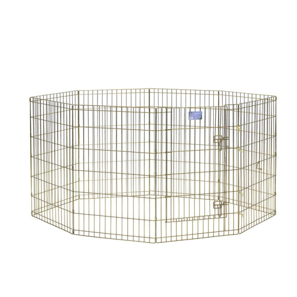 Includes full walk-thru door, (8) 24" x 42" panels, durable attractive gold finish and (8) ground stakes.