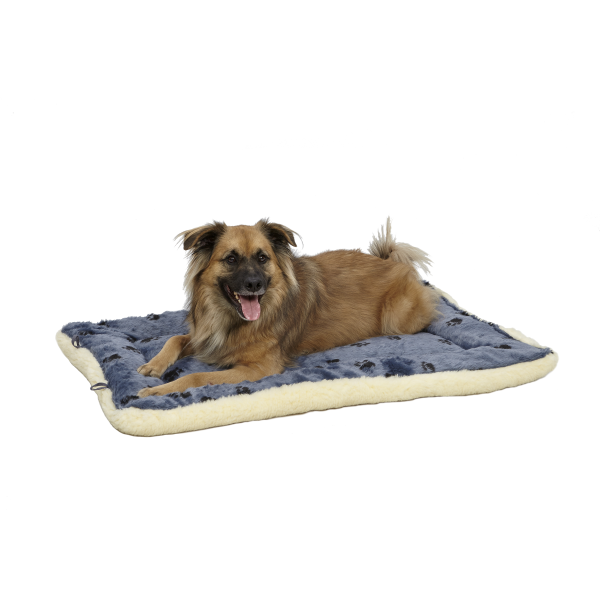 Machine washable, ultra-soft, pet bed featuring a synthetic fur paw print top and fleece bottom.