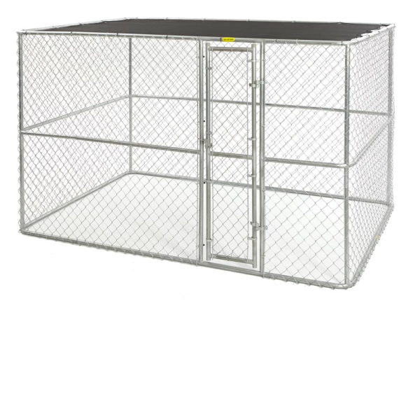 Secure outdoor kennel with a strong, steel frame and safe rounded corners. Includes a woven polyethylene sunscreen, that provides 80-percent sunblock.