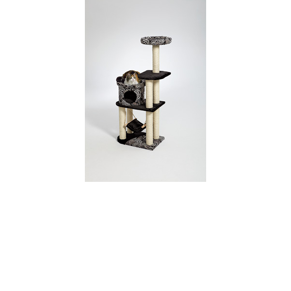 Five-tier design that features features a high-rise bolstered cat bed, cubby cat hide-out with bed topper, lounging hammock & resting platforms with sisal wrapped supports.