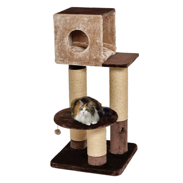 Four-tier design that features 3 extra thick & durable sisal wrapped cat scratching posts, 4 platforms, and a hide & seek cubby with a tufted comfortable cat bed.