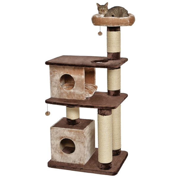 Five-tier design that features 5 extra thick & durable sisal wrapped cat scratching posts, 5 platforms, 2 hide & seek cubbies & an elevated bolstered perch.