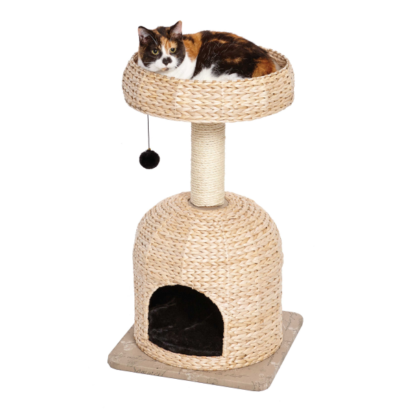 Beautiful, woven rattan cat furniture featuring a retreat for lounging and bell and ball for play.