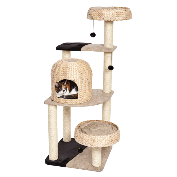 Beautiful, woven rattan cat furniture featuring a high ride perch, dome cubby, and lower level basket bed.