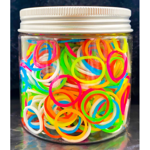 Cod#354201 Español: Ligas para Peluqueria, de latex, 60g. 500 piezas aproximadamente. Cod#35185 English: Rubber bands for Hairdressing, latex, 60g. 500 pieces approximately.