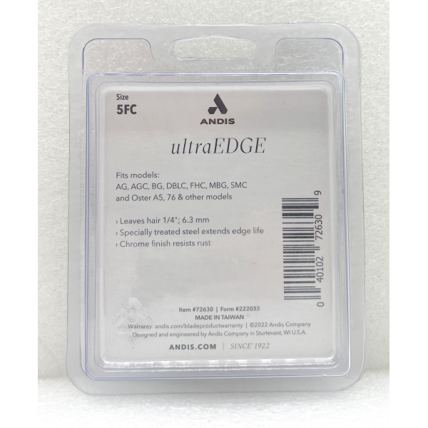 ESPAÑOL: Cuchilla numero 5 FC, deja el pelo de su mascota a una altura de 1/4 pulgadas osea a 6.33 mm , esta cuchilla calza en los siguientes modelos : (12109) MBG2 (20995) MBG-2 (21.420) AG (21465) MBG2 (21485) AG (21730) VT2 (22215) VT2 (22235) AGC2 (22330) AGC2 (22340) AGC (22345) AGC (22350) AGC2 (22360) AGC2 (22405) AGC2 (22440) AGC2 (22445) AGC2 (22465) AGC (22545) AGC2 (23085) AGC2 (23090) AGCL (23170) AGCL (23175) AGCL ( 23225) AGP (27370) AGP (27640) AGRC AGR (63785) + (63855) AGRC (63970) AGC2 (64575) AGRC AGR (64770) + (64800) AGR + (65340)