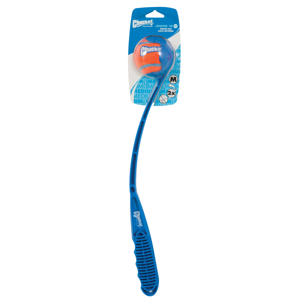 The Chuckit! Junior Ball Launcher is perfect for smaller yards and parks or for dogs that just dont like to run as far, or lose focus when they are too far away. Throw farther, faster, with the 19-inch long launcher and never bend down to pick up a slimy ball again. Durable plastic launcher firmly grasps a ball then releases it as you swing. With a little practice, you can consistently throw the ball 2 to 3 times further. Features an ergonomic grip and no slobber, hands-free pickup. Compact size. Comes with one Chuckit! ball. Use with all medium-sized 2.5 inch Chuckit! balls. Ships in assorted colors. Made in the USA.