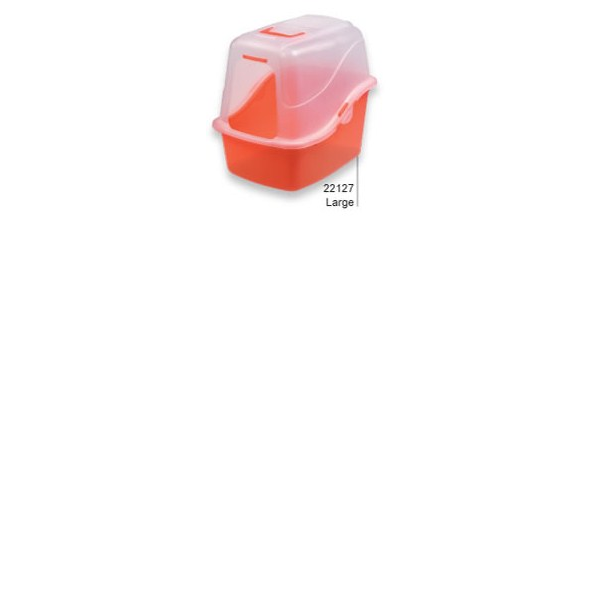 ENGLISH Hooded Litter Pan Set Large Secure locking hood , highback pan, Filter included. Size Long :18.9 inches (48.006 cm) Width: 15.1 inches (38.354cm) Height: 17 inches (43.18 cm). Color Traslucent Blue /Orange /Pink