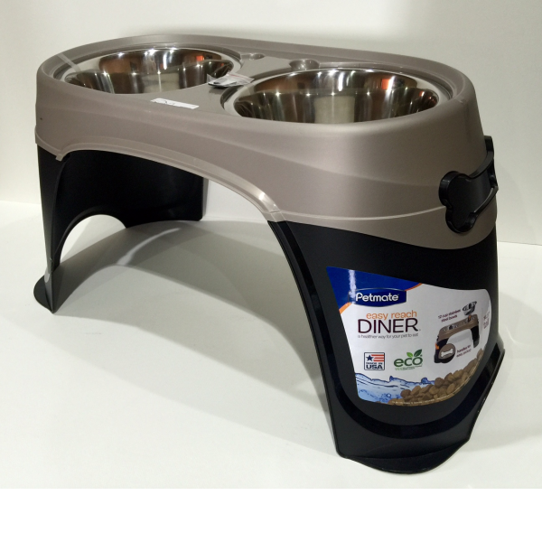 Meet dogs at their level with the Petmate Easy Reach Diner elevated feeding and watering unit. Any dog will benefit from the improved digestion that comes from eating in a confortable position, and older dogs will apreciate how easy it is on their joints. This elevated feeder and waterer prevents the stooping and disconfort associated with bending down to eat or drink. Easy-to-grip bone shapes handles for the pet parent and removable stainless steel bowls make this product easy to lift and clean. Eco, 95% pre-consumer recycled plastic content. Elevated, spill-free rims help to keep water and food where they belong and rubber inserts reduce noise and keep bowls in place. Made in USA.