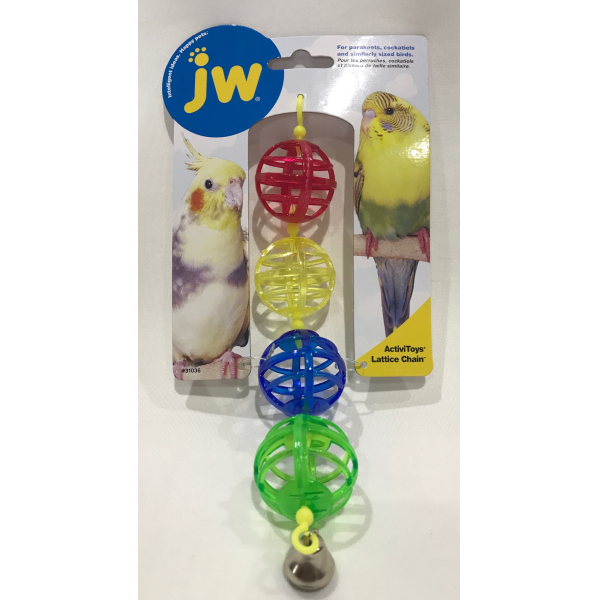 With the JW® Pet ActiviToy Lattice Chain your pet bird will be all aflutter with fun and activity. The colorful translucent hanging balls with cutouts can be stuffed with your pet birds favorite treats and watch as he tries to figure out how to retrieve them. Your pet bird will enjoy exploring and climbing. A stimulating toy that stimulates the senses with colors and sounds to help relieve cage boredom and engages motor skills. Perfect for providing parakeets, cockatiels, and other small parrots the stimulation and exercise they require for a healthy life.